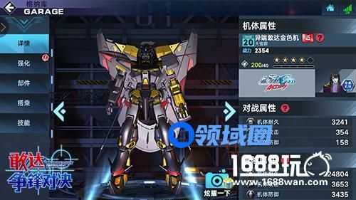 「异端高达金色机天蜜娜」初始就为3星,机体定位「近」。仅看三围数据均不是特别出众,尤其是防御力在4星时候依然直到了160左右,可见此机体是以特殊的武器技能来取胜的。该机的主射为普通的光束步枪;技能1有两招,麻痹弹和钩锁;技能2则是隐形与突进;格斗是近战机的配置,有横格有冲格,但是没有奥金之镜特殊能力是个遗憾。必杀技为捕捉发动的乱舞型,总的来说技能还是相当丰富的。