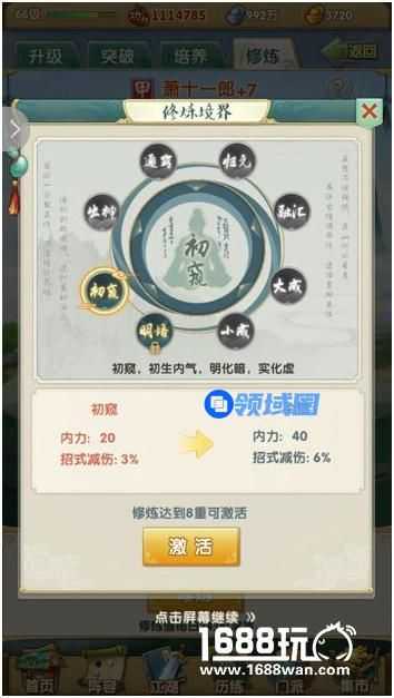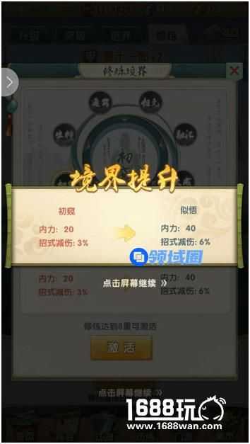 境界是原有修炼玩法的拓展内容,即当掌门和弟子修炼达到相应的程度,便可以解锁相应的境界。例如修炼到六重时会解锁第一个境界“初窥”,修炼达到八重时会解锁第二个境界“明悟”。而目前,修炼境界一共有初窥、明悟、小成、大成、融汇、归元、通窍、出神共八个层次,每个层次都会提升相应内力值,且内力值直接决定招式减伤的比例,尤其是在势均力敌的战斗中,境界的高低往往就是胜负的关键。