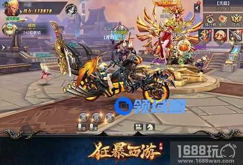 《狂暴西游》拥有包罗万象的魔幻坐骑,从异类坐骑到庞大的兽类再到飞禽,如九灵元圣、暗夜魔豹、黑风虎妖、雪域冰鹫、浴火凤凰等可谓千变万化。在坐骑系统中,除了升星解锁坐骑外,玩家还可以幻化更加霸气的坐骑,如:地狱摩托、机关神鸟、幻世魔王等坐骑。