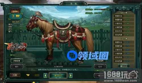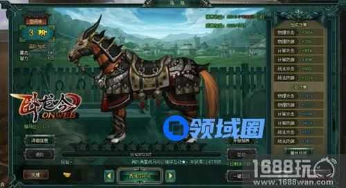 游奇《卧龙吟》中的战马可以大幅提升所有上阵武将的物攻、物防、策攻、策防、战攻、战防属性。战马不需要装备,只要解锁战马,立即获得战马的属性加成。拥有战马的数量不限,所有战马属性加成可叠加。 开启马场时可立即解锁第一匹战马,战马驯养到一定程度,可解锁新的战马。