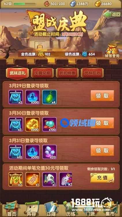 此外,为庆祝盟战新玩法正式上线,官方准备了多重豪礼活动,助战联盟早日登顶紫禁之巅。活动期间登录游戏,即可领取大量侠魂、联盟贡献、元宝,以及珍稀道具弟子化身符等珍贵物品,助各位大侠提升功力,让各位大侠在紫禁城的争夺战中如虎添翼。更多活动详情,欢迎侠士们查看游戏内活动公告!