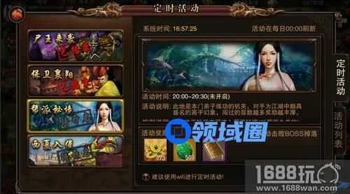 在定时活动中有一个“帮派秘境”的活动,活动以帮派为单位进行,成功击败BOSS会掉落铜钱、帮派活动积分和心法任务令等奖励。