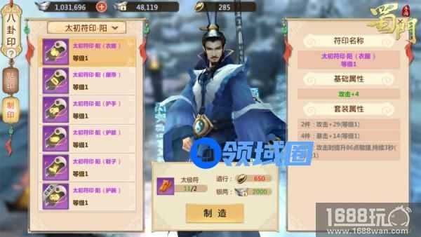 衣服、腰带、护手、护腕、护膝、鞋子都可镶嵌八卦印,当有2、4、6个防具贴上同套符印时,还可解锁套装属性,属性提升更多!制印顾名思义就是制作八卦印,是八卦印系统中的基础,若是没有八卦印也就没办法对装备进行属性提升。在“制印”页签中,选择想要制作的八卦印后,消耗太极符、道行值、银两即可制作完毕并进行镶嵌,每张八卦印只能制作一次,且附加的属性也不同,玩家可根据自己需要选择制印的顺序。