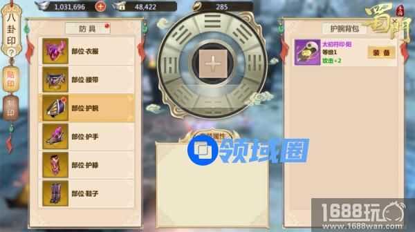 八卦印主要是为防具提升属性的系统,可从玩家背包中进入。防具在镶嵌上八卦印后即可升级成为套装,并激活相应的属性,从而提高自身战力。八卦印跟天工匣一样,是跟着部位不跟着装备,因而就算换了装备,符印属性依旧存在,所以大家也不用担心符印浪费的问题。