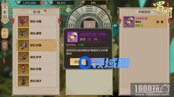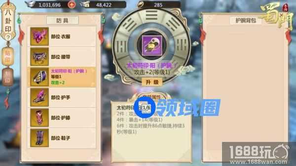 制作好八卦印后,即可前往“贴印”页签为防具镶嵌八卦印,来提升装备属性值。将八卦印镶嵌在装备上,使装备升级成为套装并激活相应的属性。当同时有2/4/6件防具镶嵌了同套八卦印,成为同一件套装时,即可激活套装属性。