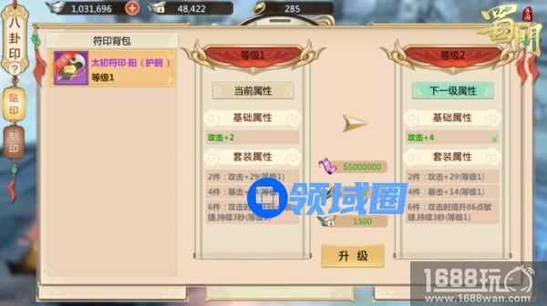 八卦印制作好后等级为1级,可进行升级来提升八卦印的基础属性和套装属性等级。八卦印升级需要消耗道行值、灵力和银两,当前最大等级为7级。