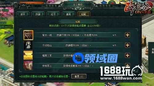 当主公等级达到50级时获得一个可以自由分配的技能点,之后主公等级每升50级都可以获得一个技能点。当主公等级达到100级是可以升级技能到2级,400可以到3级,800可以到4级,1400可以到5级。1级升2级需要1个技能点,2级升3级需要2个技能点,3级升4级需要3个技能点,以此类推。所有技能点都是额外获取,不会影响其他四项主公技能点数的获取,并提升其他4项主公技能上限。只能上阵一个主公技能。而且在争霸赛,竞技场,群雄逐鹿中都可以使用主公的韬略技能。