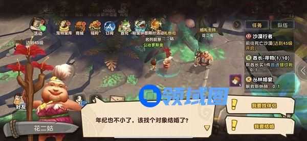 在《疯狂原始人》手游中,当勇士和心爱的Ta亲密度满足系统规定后,就可以一起组队前往蝴蝶森林寻找“花二姑”选择婚礼,如果不知道花二姑的具体位置,可以从关系里选择寻路到NPC,热心的“花二姑”会给两位准备不同档次的原始婚礼。注意队伍中止可以有要结婚的两个人,且队长携带任意的婚礼契约,作为见证。