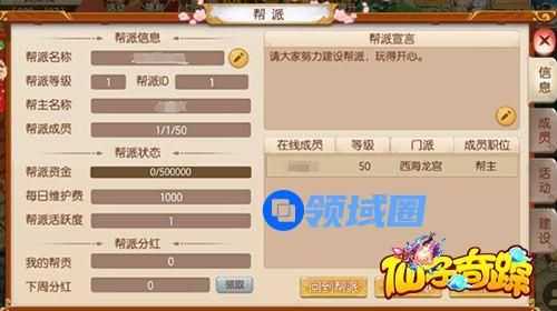 打开【帮派】-【信息】界面,帮派成员都可以查看帮派名称、等级、成员数量、资金等信息,还可以领取帮派分红、进行帮派捐献。如果玩家是帮主,可以发送帮派通知。