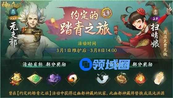 在活动期间,当降妖师们完成踏青活动剧情,就可以免费获得活动限定SR妖灵“扫晴娘”。并且在完成每日小目标后,还可以累计获得2枚玉璧和6枚唤灵符等重磅福利。