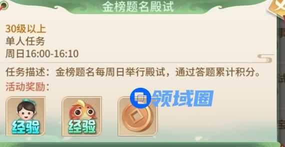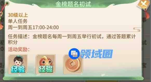 周一到周五,每天的17:00-24:00,点击游戏界面的金榜题名图标即可参加。只要等级满足30级以上的玩家,都可以参与。