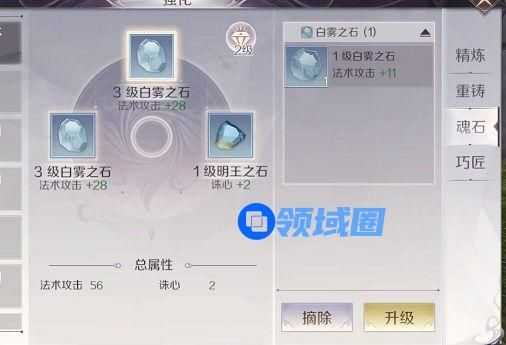 魂石不仅可以直接用来镶嵌,也可以用来合成和升级,使其附带属性更加强力,每三颗相同的魂石可以合成一颗高一级的魂石。如果想直接将魂石升级,系统会自动计算当前魂石的数量和需要补充的数量,魂石的等级越高,在升级时需要的魂石数量也就越多。