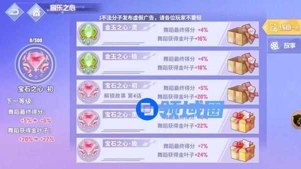 音乐之心是一个比较重要的加分点,音乐之心的提升是对舞蹈最终得分的加成,目前最高级的音乐之心可以提供10%的舞蹈分加成,音乐之心的提升主要由左下角的猫(明明就是狐狸!)发布的成长以及日常任务来提升,另外,歌舞姬的每日和部分送礼得到的任务也会提供音乐之心的经验。