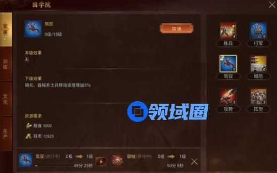 军事科技:驾驭和行军可以提高骑兵、器械兵移速和步兵移速。