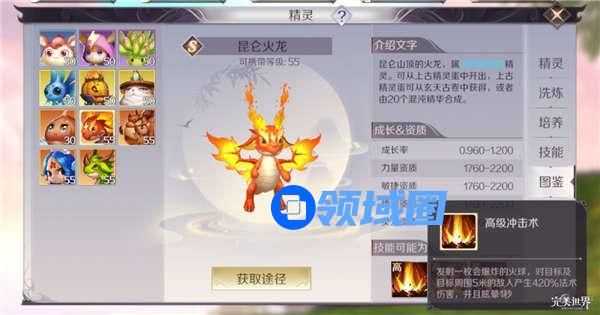 昆仑火龙则是S级精灵,获取方式是通过上古精灵蛋孵化,它有着非常强力的增益BUFF,并且高级神龙摆尾能够让主人对眩晕敌人造成的伤害提高,自身也是有眩晕技能,非常给力,适合有自带眩晕的输出职业使用,没错,说的就是魔妖兽和羽芒。
