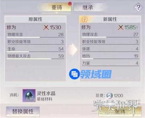 在重铸方面,如果重铸装备在新属性和原属性修为相差不多的情况下,我们自然是选择以物理攻击方面的属性加成!