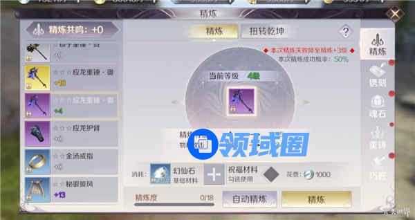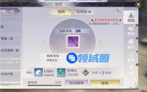 我就以42级的品阶为6的装备为例进行讲解,首先需要先来说明两个机制,首先,装备在+4之前强化失败不降级,我们可以放心强化。第二点就是在强化界面的左下角会有一个精炼度,当精炼度满了之后,下次强化必成功,每次强化失败都会获得一定的精炼度。但不要高兴的太早,随着强化等级的提升,精炼度会越来越难满,比如当前装备强化+5,失败一次精炼度才增长5点。