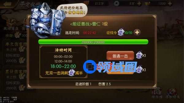 平定乱世的攻击方式共有两种,普通攻击和无双一击(2.5倍伤害)两种,这两种方法分别会消耗掉1个和2个征伐令(不过每天的0~2点、12点~14点和18点~22点,无双一击只需要消耗1个征伐令)。