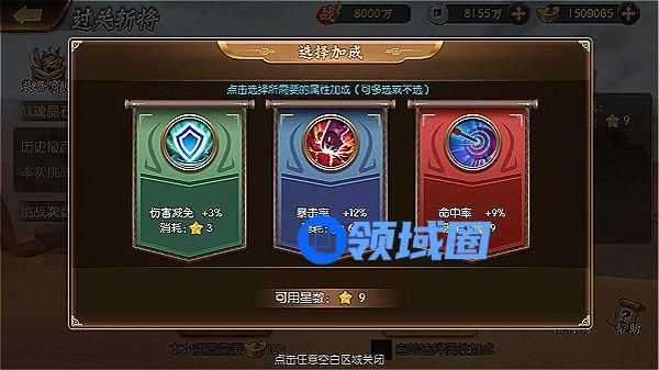 每通过三个关卡数后可以进行属性选择,选择需要消耗之前挑战获得的星星数,消耗的星星数越多,获得的属性加成也就越多。合理的选择属性加成,可以让你更轻易的打败关卡怪物。