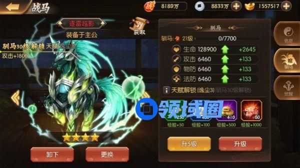 战马升级需要消耗指定的喜好品来获取经验值,战马等级越高消耗的喜好品越多,增加的属性越多。