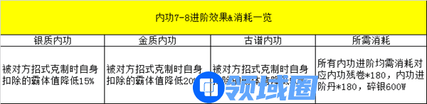 解析:内功7-8的进阶,除了气血上限、攻击强度、防御力、招架、招架忽视等内功属性外,其所附加的特殊效果主要为进阶效果。7-8进阶效果为:被对手招 式克制时自身扣除霸体值降低,根据内功的品级,降低的幅度不同,银质和金质内功差别不大,而古谱内功降低的幅度为前者的二到三倍,该特殊效果主要在战斗中 表现的作用显著,对喜欢PK的玩家增幅较大。