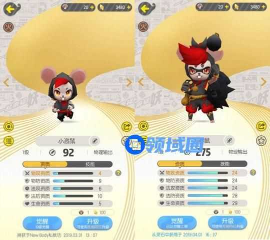 首先,我们先来看俩个同系列的妖灵,谁的评分最高!因为评分高的妖灵才有培养的必要,否则只会是浪费云纹和符印,再者就是看资质!(小盗鼠)系列的妖灵,是以物理输出为主,而哪个物理输出资质高,那个妖灵培养起来才指的!