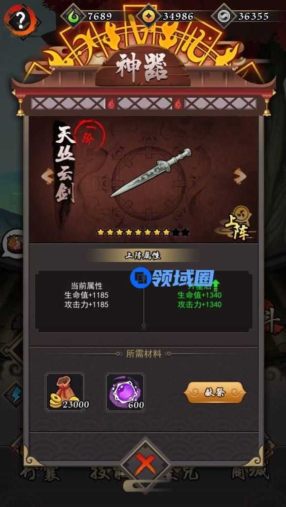 第三说神器,前期神器提升很大,这个时候装备数值都很低,强化起到的提升不明显,所以主要升神器,氪了金的肯定推荐用勾玉去换神器升级材料来升级,当然也不用全力去怼。一阶神器升级一次攻、血提升120。到了有四星五星装备的时候,相比所需材料巨大的神器强化装备又来的容易一些。