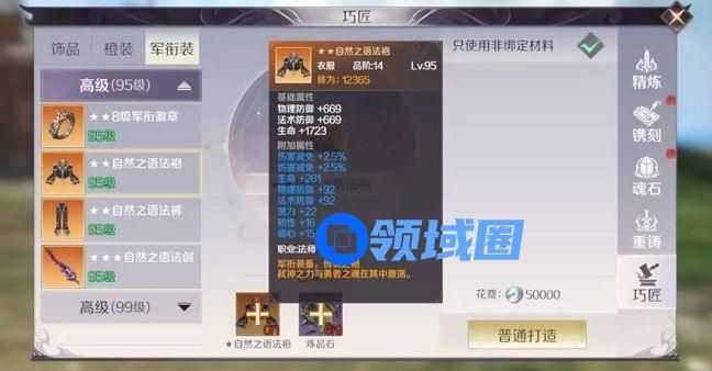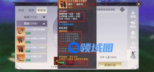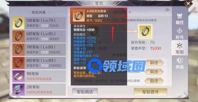 使用对应材料可将89级13阶军衔装备,升级为95级14品军衔装备以及99级15品军衔装备。