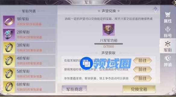 在达到八军后,继续获得的声望可用于兑换“八军军功箱”,开启宝箱即可获得八军装备升级所需的材料。