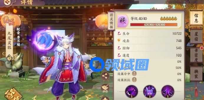九尾出击:随机攻击敌方9次,每次造成九尾灵狐攻击60%(+6%)的普通伤害,并以40%(+10%)的概率使其受到持续1回合的持续伤害效果,使用后立即获得回合。冷却时间3回合。