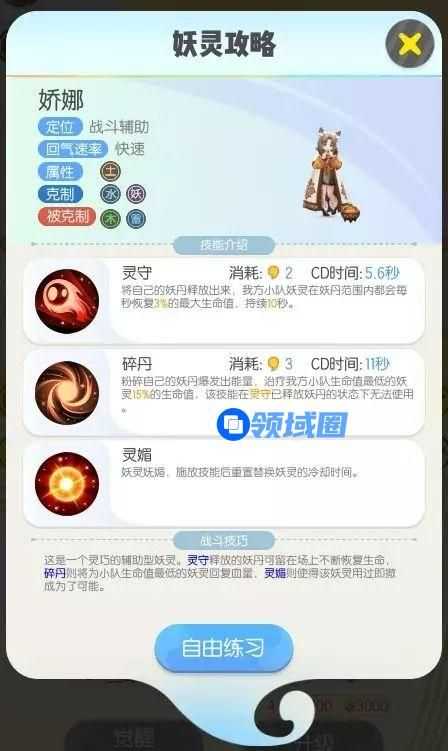 娇娜可以算是目前版本妖灵中最强辅助之一了。她的一技能灵守释放后,接下来在场上的妖灵都将缓缓恢复生命。二技能碎丹则可以给自己小队血量最少的妖灵一次性恢复大量生命值。被动灵媚更是可以在使用了技能后,立即结束换人冷却。