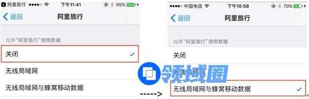如果《Disorder》不存在此列表中,请根据下面的步骤继续操作:请选择列表中已有的任意一款应用,对其联网权限进行设置。如图所示,将阿里旅行APP的联网权限设置为“关”后,再设置为“无线局域网与蜂窝移动”