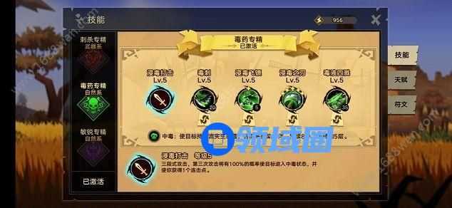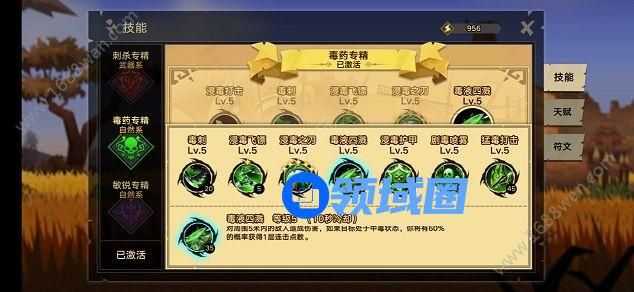 毒药专精的刺客想要打出高额的伤害,首先要学会“叠毒”,也就是要不断对敌人叠加中毒状态。因为中毒状态是可以传染并持续不断对敌人造成伤害的,这就是打出群体伤害的关键,接下来看一下毒药专精列表技能。