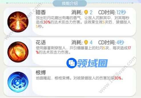 分析:三阶技能根缚对被禁锢的敌人造成伤害,暗香回复时间长,可搭配有禁锢效果的蛙护法等,让根缚可以发挥到其作用。