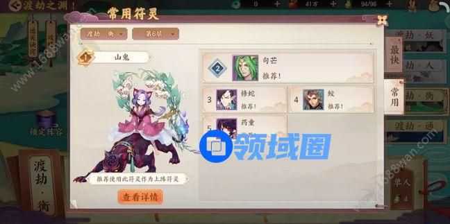 山鬼是输出主力,药童是治疗主力,其余三位则是全能型符灵,能攻能奶,为整支队伍提高了很大的容错率。最主要的是这套阵容培养起来很简单,可以很快达到能够战斗的地步。