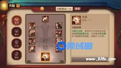 天赋系统的上线为玩家提供了更清晰的流派选择,也为后期精英组队等新玩法的更新作铺垫。天赋系统针对不同玩家的喜好推出了相应的天赋擅长,目前 版本包括轻灵、重斩、铁壁和鹰眼四类,而每一类天赋都为6层,每层天赋激活三次或以上后,才可对下一层天赋进行激活。每个天赋功能或增加个人暴击,格挡 率,或能为团队付出更多贡献,如移除友军负面状态。激活天赋之后,玩家战斗属性能得到很大程度提高,对于怪物的伤害力大大提升,而四类天赋针对的属性加成 也不尽相同:轻灵类的天赋擅长制造爆发性伤害,主要是暴击、连击的加成等;重斩类擅长破甲,高攻低频,例如背击的加成;铁壁类则擅长防御、提高格挡率,同 时帮队友承担伤害,提供团队免伤;而鹰眼类擅长辅助,削弱敌人护甲、回复自身和友方的血量、移除自身和友方的负面状态。除此之外,当玩家将一类天赋激活到 第六层时,即可习得对应天赋的天赋主动技,在战斗中额外获得一个强力主动技能,大大提高自身的战斗力,如无双可使冷却状态中的技能即可脱离冷却。