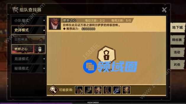 史诗模式中只有两个副本关卡:日怒神庙和燃烬之心。日怒神庙每天可以挑战两次,一周可以挑战五次,推荐战力为2800000,战斗胜利可能获得一些高级装备。燃烬之心要到65级才开放,挑战次数与日怒神庙相同,推荐战力为6300000,是日怒神庙的两倍多呢。所以,此副本奖励的装备也就更高级。