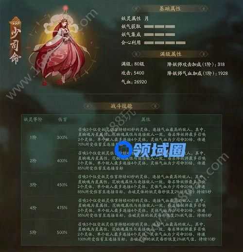 妖灵达到5阶时,召唤2个仅受妖灵伤害持续40秒的灵体,连接气血最高的敌人。灵体气血为少司命20倍,传递100%所受伤害至连接目标。击破灵体的妖灵每秒恢复2%妖气值,持续10秒。
