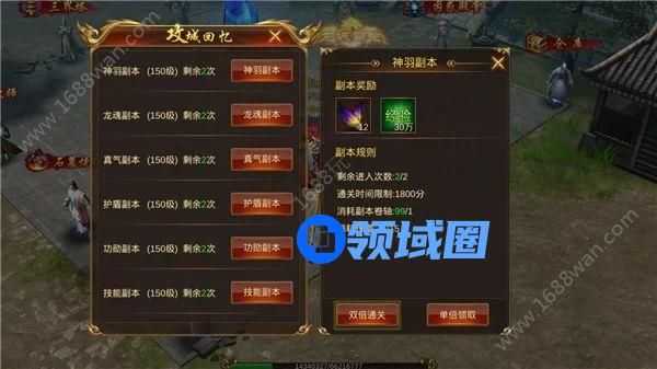 攻城回忆副本内有神羽、龙魂、真气、护盾、功勋和技能六大副本玩法,每个副本每日限定挑战2次,刚好对应攻城回忆副本每日12次的挑战限制。