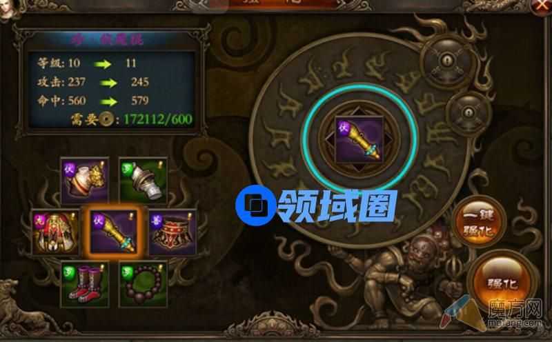 装备可以进阶和强化的呢,提高装备的强化等级,可以让装备属性得到小幅度的增长哦。每次强化装备都会获得一定数量的强化经验,当强化经验到达上 限时,装备的强化等级会提升一级,但强化等级不能高于角色等级。点开强化的图标进入强化页面,之后选择一件装备之后,然后选择一键强化,是不是很方便呢? (*^__^*) 嘻嘻,强化需要消耗铜钱,铜钱可以通过游戏内副本,擂台赛,十八重楼等方式获得呢。