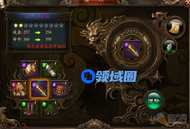 装备进阶可以提升装备强化时的属性成长值,随着装备进阶度的提升装备的品质也会得到提升。进阶也是点击相应的图标进入,之后选择一件装备就会出现进阶需要的材料,要材料足够才能进行进阶呢。大部分材料都在副本里随机掉落呢。