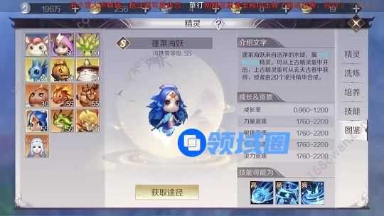 治疗辅助型精灵有两种,一种是治疗型精灵“A级-水葫芦”、另一种是治疗解控型精灵“S级-蓬莱海妖”。两只精灵都拥有一个法术加成的攻击技能,其他都是治疗、加盾或者解控的辅助类技能。