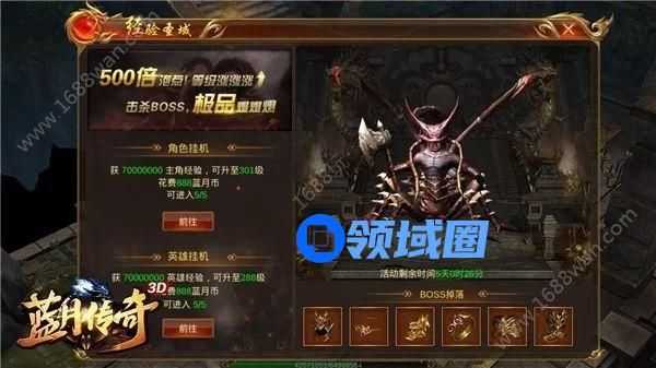 经验圣域,等级猛增不是梦! 经验圣域属于活动玩法,只有在活动期间才可以进入。经验圣域里拥有500倍泡点的福利以及极品装备,看着就心动。进入经验圣域需要消耗蓝月币,每天可进入5次。当所有任务清理完,剩余的时间可以前往经验圣域。如果玩家第一天刷满5次经验圣域,基本上稳打稳的进300级!