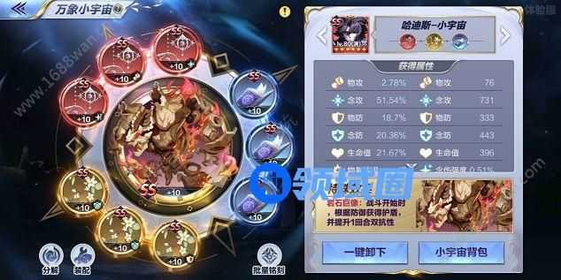 效果解析:这一套小宇宙的主要看点在于防御属性用以保障被签订契约队友的稳定性,再通过副属性加一下念攻属性还是比较不错的,放弃了部分血量的主要原因在于伟大的日蚀Ⅱ本身就附带吸血效果,可以保障续航作用性,只要第一回合不被秒掉,后续就会比较安逸。