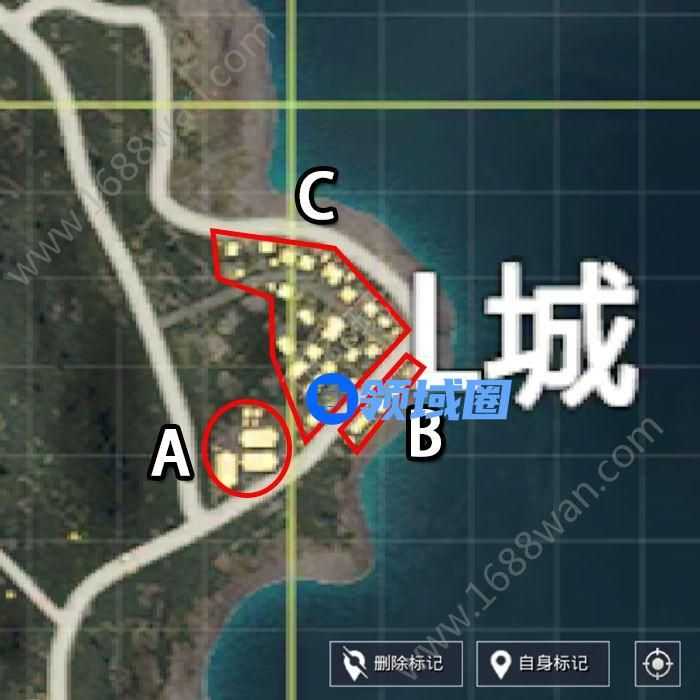 L城可以分为三个区域,A区域是由三个大仓库组成的,这里是比较肥的点,不过距离城市有一段距离,而且三仓外有一个带天台的三层楼,很容易被架枪。B区域是海边的一排房屋,一般很少有玩家到这里来。C区域就是大面积的城区了。绿色的星星标记是L城唯一的车库,不过L城周围的刷车点比较多,我们可以在跳伞的时候留意周边的车的位置,没有必要非要盯住车库的车,因为有不止一双眼睛盯着这里。