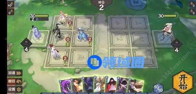 由于思路是叠法术,所以甲位一般是不需要刻意占位的,注意昙无梦的戊位与丙位有无生物,同时确保自己的戊位与己位有生物能扛住,每回合尽可能多的用法术(法术牌费用会越来越高,所以第一回合一定要用五个)要注意费用重置卡(欲之契)很危险,除非撑不下去,否则不要用(用也必须十灵用),下图为第二回合图:
