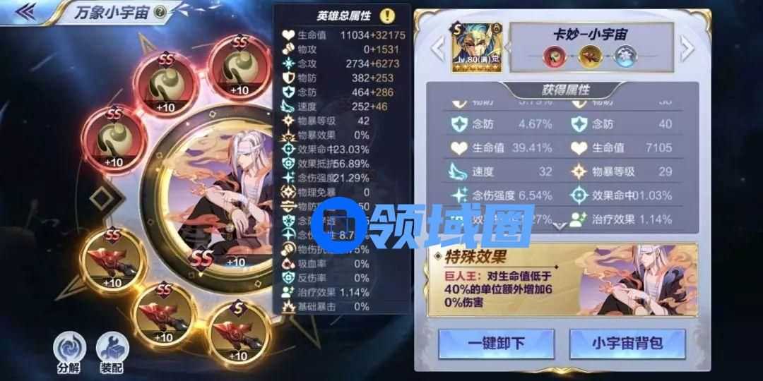 卡妙的小宇宙搭配最主要还是要偏向于效果命中,之后是念力攻击、生命值。效果命中决定了冰霜印记的叠加速度与控制能力,配合高命中率的冰河之后可以做到完美的控杀效果。相对于念力攻击的爆发能力,身板较脆的卡妙还是需要利用控制来换取自身的安全。