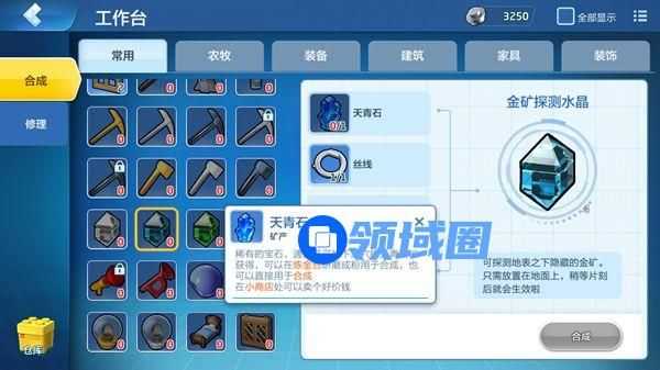 在木制的工作台中玩家将可以找到各种矿石探测水晶的存在,并可以查看制作其所需要的基础的配方。
