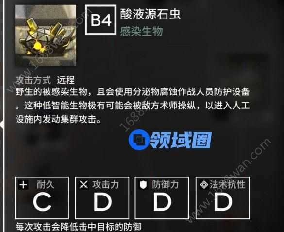 相比于目前源石虫一系的大哥高能源石虫,面板被全面碾压,特殊能力减甲效果也并不明显,目前关卡达不到量变积累到质变的效果,其升级版酸液源石虫a也通过解包得到了数据:
