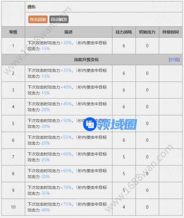 推荐点到7级,7级算是一个小质变,减攻25%,技力消耗5,也就是6次平A,7.5s,一个循环,持续5秒,覆盖率67%。